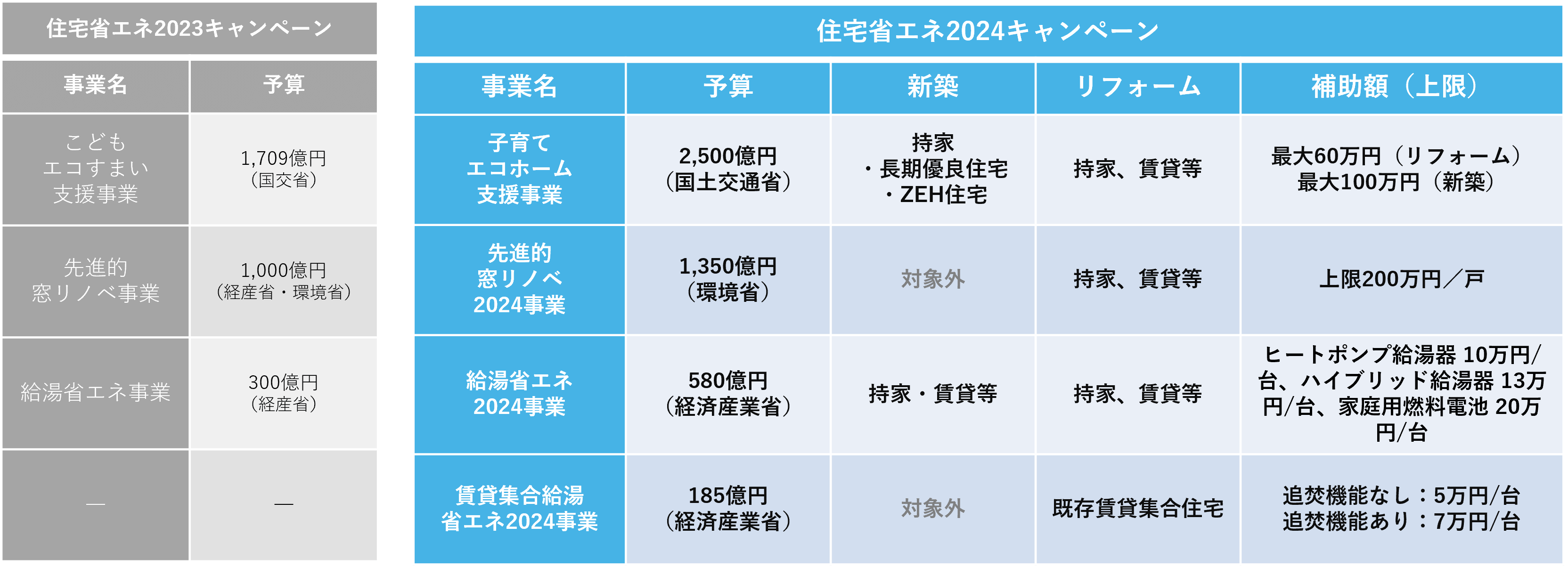 2024年に注目の補助金制度として「住宅省エネ2024キャンペーン」があります。このキャンペーンは、2050年カーボンニュートラルの実現に向け、家庭部門の省エネを強力に推進するため、住宅の断熱性の向上や高効率給湯器の導入等の住宅省エネ化を支援する4つの補助事業の総称です。2023年にも同様のキャンペーンはありましたが、2024年版ではさらに「賃貸集合給湯省エネ2024事業」が新たに追加され、予算と補助金の支給額が大幅に増額されました。